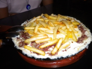 Depois, o garçom que parecia Woody Allen, um pouco mais alto do que o ator e diretor de cinema recomendou que experimentássemos a "Paraibinha", coqueluche da casa: carne seca desfiada e acebolada, queijo derretido e aipins fritos e/ou batatas fritas servidos na chapa.