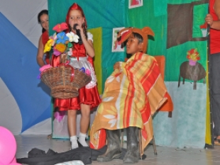 Em seguida, foi à vez dos atores mirins da Escola Zacarias Dantas, a única do setor rural participando das apresentações, subirem ao palco para recontar o clássico Chapeuzinho Vermelho. A história da Bela Adormecida foi recontada pelos alunos da Escola Municipal Norma Vídero, que também fizeram bonito no palco. O último grupo de pequenos atores a subirem ao palco foi o da Escola José Odoque Teixeira para contar a história da Formiguinha e a Neve.