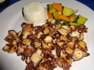 De principal, yo me deliciei com camarões a la diabla, al gusto y a la plancha, al molho de alho com pimentas vermelhas, tomate colar e salsa; e a madame serviu-se de um pulpo al gusto en su tinta, embiscochado, a la veracruz. Como aprecia um polvo essa madame!. Em todos sus gustos!