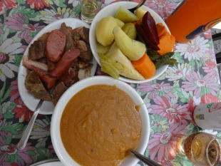 A casa estava cheia. Um grupo enorme festejava um aniversário com direito a torta e parabéns pra você. E estava todo mundo se deliciando no cozido. A nossa frente, outro grupo de jovens mujeres também fazia o mesmo.