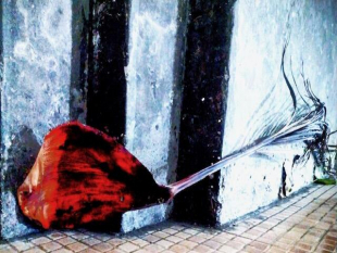 O que vemos é, à primeira vista, uma folha de palmeira ressecada, deitada no chão, encostada a um muro de concreto. Mas o olhar atento percebe mais: sua ponta fibrosa e alongada lembra o cabo de uma colher em queda. E é aí que tudo muda.