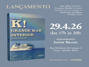 João Telles (Saúde Br) e Lourenço Mueller (Kirimurê) convidam para o lançamento simultâneo do vernissage e o lançamento simultâneo de telas e livro "K! Grande Mar Interior", dia 29 próximo, das 17 às 20h, no Restaurante Saúde Brasil, Rua Humberto de Campos, 6, Graça, Salvador.