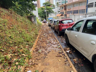 Que horror está o trecho da ladeira Guadalajara e extensão da Amilcar Falcão no sopé do Morro do Gato com destino a José Sátiro e ao Chame-Chame, com uma quantidade imensa de frutinhos das amendoeiras que caem no passeio e na rua.