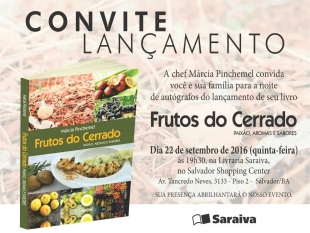 A 'chef' baiana Márcia Pinchemel lança no próximo dia 22, a partir das 19h30min, na Livraria Saraiva do Salvador Shopping o livro Frutos do Cerrado – Paixão, Sabores e Aromas - da gastronomia Cenro Oeste do pais, especialmente do Estado de Goiás, onde reside.