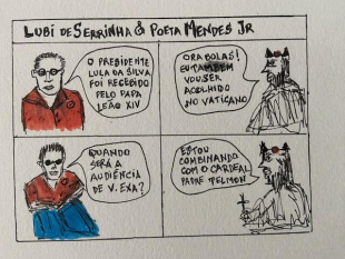 O Lobisomem de Serrinha também vai ser recebido no Vaticano e na tirinha deste domingo ele dialoga com o poeta Mendes Jr sobre o assunto. Ninguém sabe ainda se ele terá um encontro com o papa Leão XIV como aconteceu com o presidente Lula da Silva. É provável que sim e os acertos segundo o carrapeta para sua estada no Vaticano estão sendo articulados pelo cardeal Telmon.