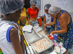 3. Aos 73 anos, a aposentada Anfrísia Leal aproveitou para levar seus conhecimentos para a oficina de sequilhos, ensinando a fazer docinhos com coco, geléia de cacau e goiabada. "Para mim, é importante trazer um pouco do que conheço, apresentar um novo ofício. Eles são adolescentes, querem ter um dinheirinho. Como eu ensinei a meus filhos, que levavam um docinho para a escola e vendiam, agora ensino para outras pessoas. Também já ensinei a fazer sabão, todo ano eu participo”, contou.