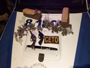 Com os quatro os policiais apreenderam dois revólveres calibre 38, um aparelho celular, 167 porções de maconha e dois tabletes prensados da mesma droga, 148 pinos de cocaína e crack divido em 25 pedrinhas e uma porção maior da pedra. Toda a droga estava acondicionada em uma mochila preta.